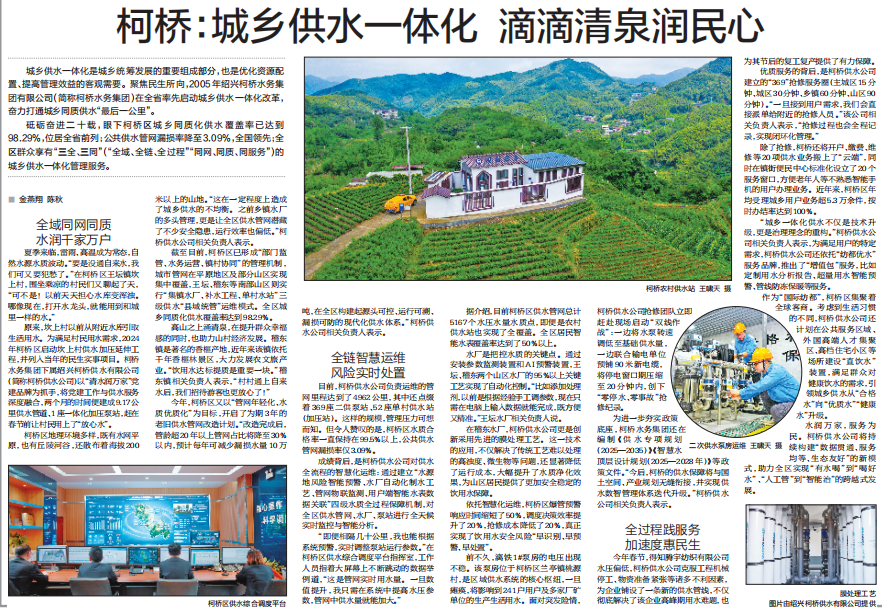 6月26日,《浙江日報》專版刊登《柯橋:城鄉(xiāng)供水一體化 滴滴清泉潤民心》,全面深入報道了柯橋城鄉(xiāng)供水一體化的創(chuàng)新探索與實踐成效。