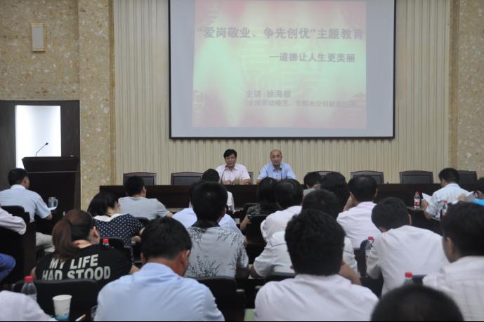 8月11日下午,結(jié)合集團(tuán)“愛崗敬業(yè)、爭先創(chuàng)先”主題教育活動,供水公司邀請全國勞動模范、紹興市制水公司副總經(jīng)理徐海根為公司班組長以上管理干部作題為《道德讓人生更美麗》的宣講教育,共80余人聆聽了模范的精彩宣講。會上,徐海根結(jié)合自身工作實(shí)際,用樸實(shí)的語言講述了孝心、愛心、誠心、責(zé)任心在工作中的重要性與必要性,鮮活生動的感人故事催人奮進(jìn)。與會的每個(gè)人在這里接受了一次心靈的洗禮,取得較好的效果。