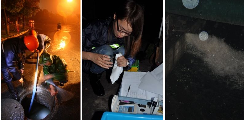 (圖為工作人員進行沖洗排放前的關閥門操作及對排放口水質(zhì)化驗工作)