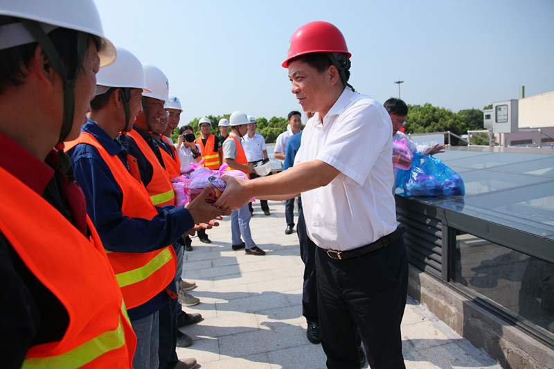 圖為集團(tuán)黨委書記、董事長周儉慰問紹興水處理公司脫氮工程施工人員