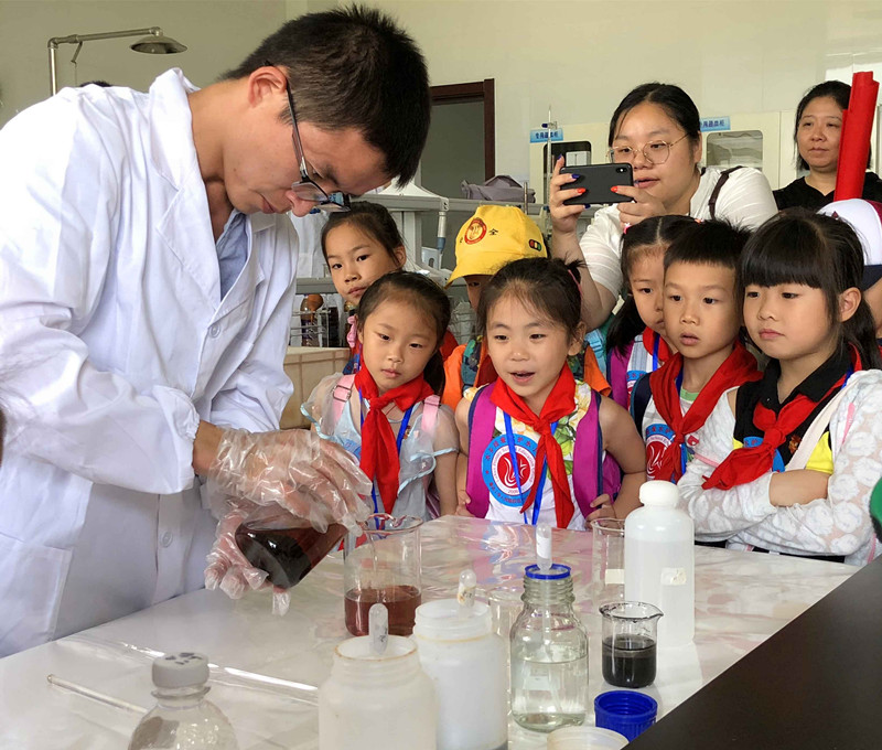 “經(jīng)過三天三夜,混濁的污水就這般變得干凈了?,F(xiàn)在,讓我們把這個(gè)時(shí)間縮短,來一次奇跡的見證。”實(shí)驗(yàn)室里,學(xué)生們圍繞在實(shí)驗(yàn)試劑的瓶瓶罐罐旁,平日里嚴(yán)謹(jǐn)?shù)膶?shí)驗(yàn)技術(shù)人員瞬時(shí)變成了神奇的魔術(shù)師。“這就是我們平時(shí)未經(jīng)處理的工業(yè)印染污水,只有通過一系列的污水處理環(huán)節(jié),污水才能被排放至河流和大海中。”實(shí)驗(yàn)室技術(shù)人員拿出用作處理污水的專業(yè)試劑,開始帶領(lǐng)學(xué)生做“污水絮凝沉淀”實(shí)驗(yàn)。用膠頭滴管吸取試劑,使用玻璃棒攪拌、靜置,通過一系列的專業(yè)步驟,一杯杯污水慢慢地開始變清。“這就是絮凝沉淀實(shí)驗(yàn),通過加入‘混凝劑’,水中的污染物被不斷凝聚,最終沉淀至燒杯底部,從而使污水變清。”學(xué)生們一邊認(rèn)真聽講一邊情不自禁“哇,水變清