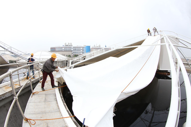 日前,江濱水處理公司20萬(wàn)噸/日集中預(yù)處理二期工程污泥濃縮池進(jìn)入鋼結(jié)構(gòu)膜安裝階段,預(yù)計(jì)于本月底基本完成。該除臭系統(tǒng)由8個(gè)鋼結(jié)構(gòu)反吊膜裝置及2個(gè)生物除臭裝置組成,為公司第四批建設(shè)的除臭項(xiàng)目。至此,公司在臭氣治理上已累計(jì)投入2000余萬(wàn)元,目前廠(chǎng)區(qū)內(nèi)高、中濃度臭氣基本實(shí)現(xiàn)全收集、全治理,為實(shí)現(xiàn)“生態(tài)江濱”目標(biāo)打下了堅(jiān)實(shí)基礎(chǔ)。