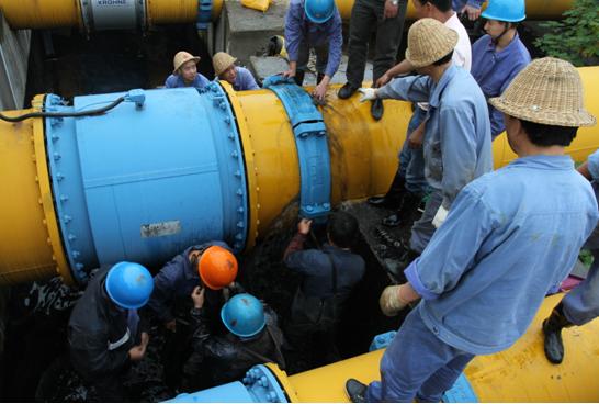 當(dāng)時(shí),工作人員正在現(xiàn)場(chǎng)巡視,實(shí)然發(fā)現(xiàn)市排DN800管道流量計(jì)后硬性伸縮節(jié)滲漏噴水,于是立即按照?qǐng)?bào)告制度進(jìn)行匯報(bào),該公司立即啟動(dòng)應(yīng)急預(yù)案。搶修分兩路展開,一隊(duì)人員用應(yīng)急水泵,將滲漏的污水打入生產(chǎn)系統(tǒng)中;另一隊(duì)人員對(duì)滲漏點(diǎn)進(jìn)行檢查,確定是因硬性伸縮節(jié)的兩顆螺絲膨脹后崩斷造成爆管。在通知排水公司對(duì)進(jìn)廠流量進(jìn)行控制的同時(shí),現(xiàn)場(chǎng)搶修指揮人員立即組織維修人員對(duì)硬性伸縮節(jié)進(jìn)行更換。維修人員在采取相關(guān)安全措施后,冒著不斷噴出的污水,立刻進(jìn)行拆裝螺栓作業(yè)。隨著水流一點(diǎn)點(diǎn)變小,漏點(diǎn)最終被徹底控制。