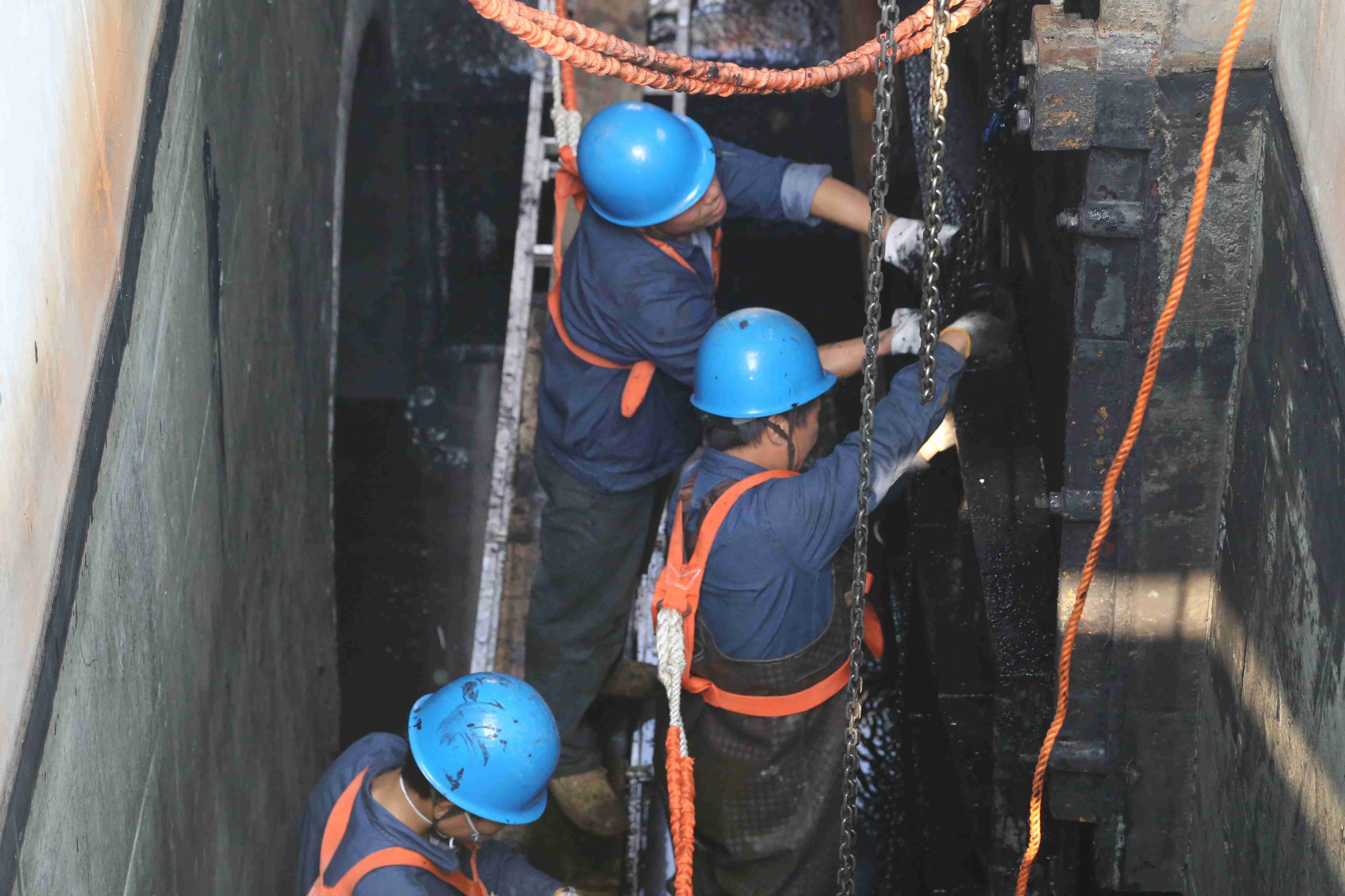 此次維修工作地點(diǎn)全程為混凝池池底,面對池底污泥層厚、空間狹窄等難題,公司前期組織維修人員、安全員等多次進(jìn)行方案探討并確定3套維修方案;在維修工作進(jìn)行過