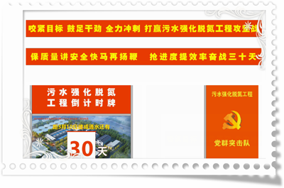 目前,在污水強(qiáng)化脫氮工程現(xiàn)場(chǎng)明顯位置,已樹(shù)立工程沖刺倒計(jì)時(shí)牌。公司要求,各級(jí)領(lǐng)導(dǎo)干部人員必須清醒認(rèn)識(shí)到形勢(shì)嚴(yán)峻,要在最后1個(gè)月的時(shí)間里拿出更大的干勁全面沖刺,確保工程建設(shè)任務(wù)的按期完成。同時(shí),公司黨支部錢(qián)書(shū)記也特別強(qiáng)調(diào),要充分發(fā)揚(yáng)黨員干部先鋒模范帶頭作用,使廣大黨員平常時(shí)候看得出來(lái)、關(guān)鍵時(shí)刻站得出來(lái)、危急關(guān)頭豁得出去,要將把黨的政治優(yōu)勢(shì)轉(zhuǎn)化為項(xiàng)目推進(jìn)優(yōu)勢(shì),把黨建力量凝聚為奮斗合力,確保工程順利建成通水。